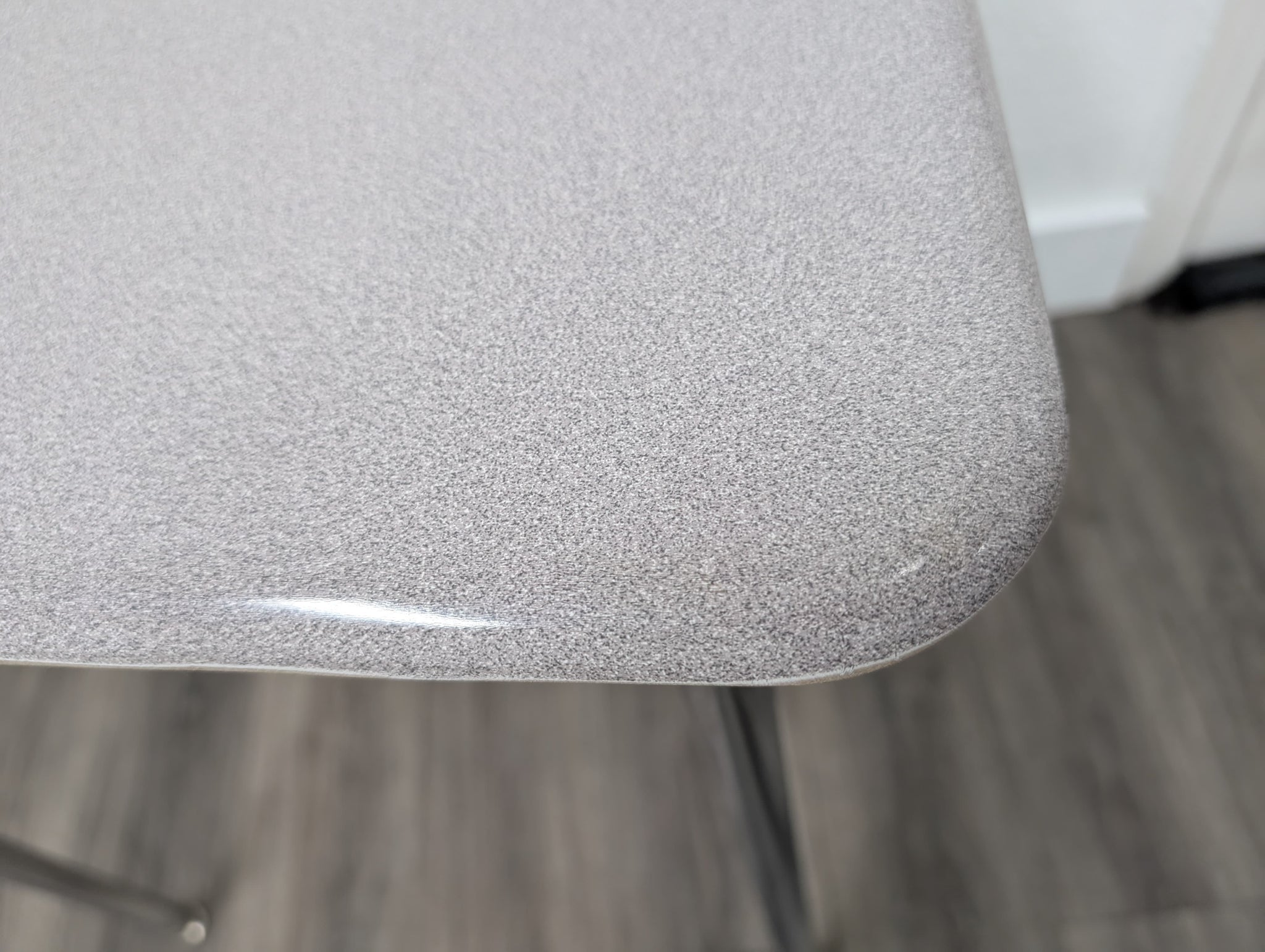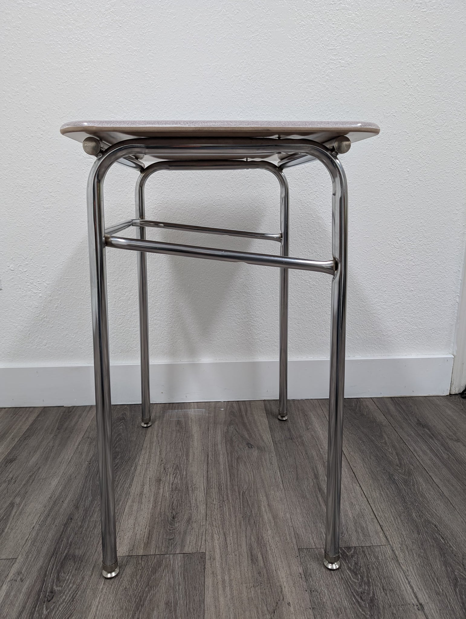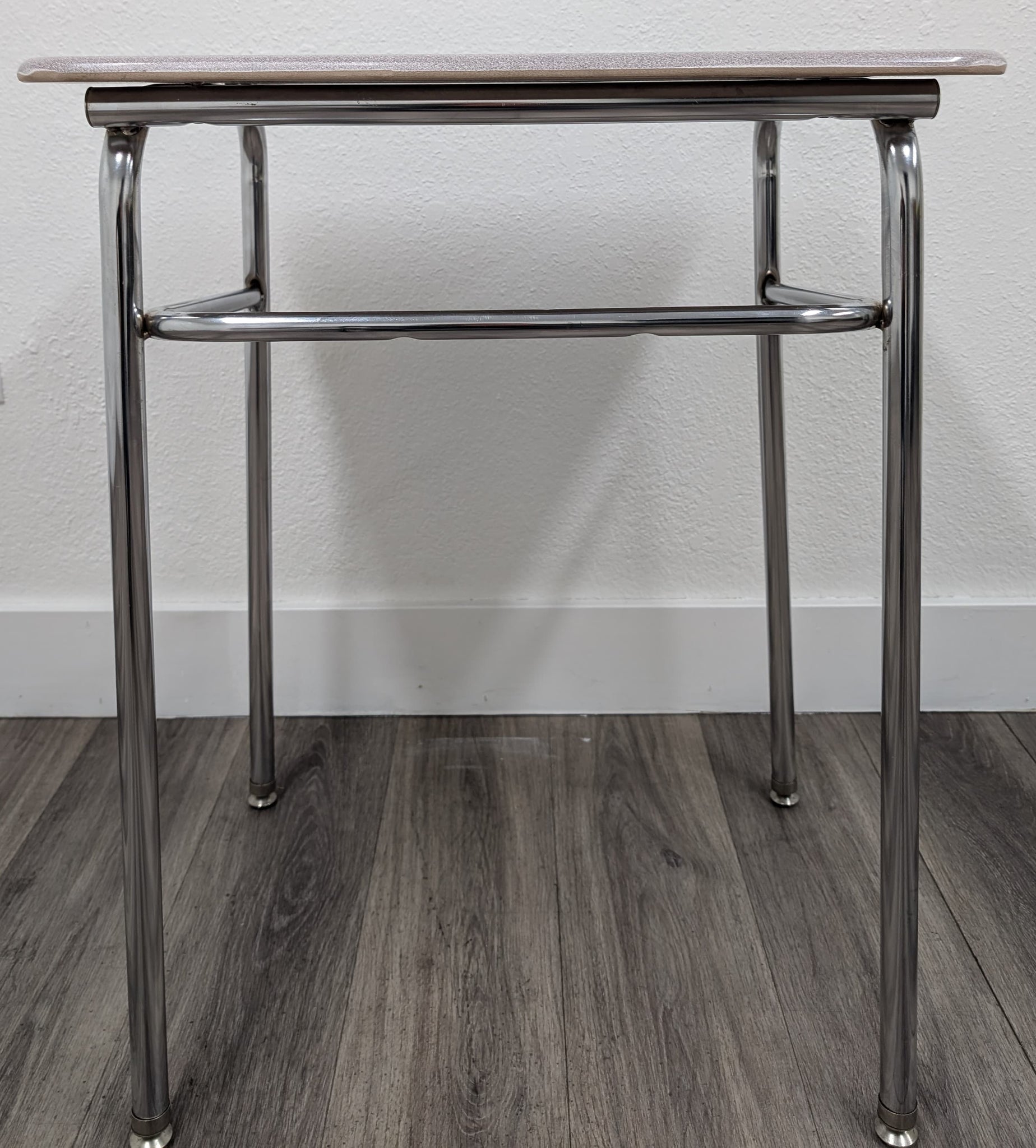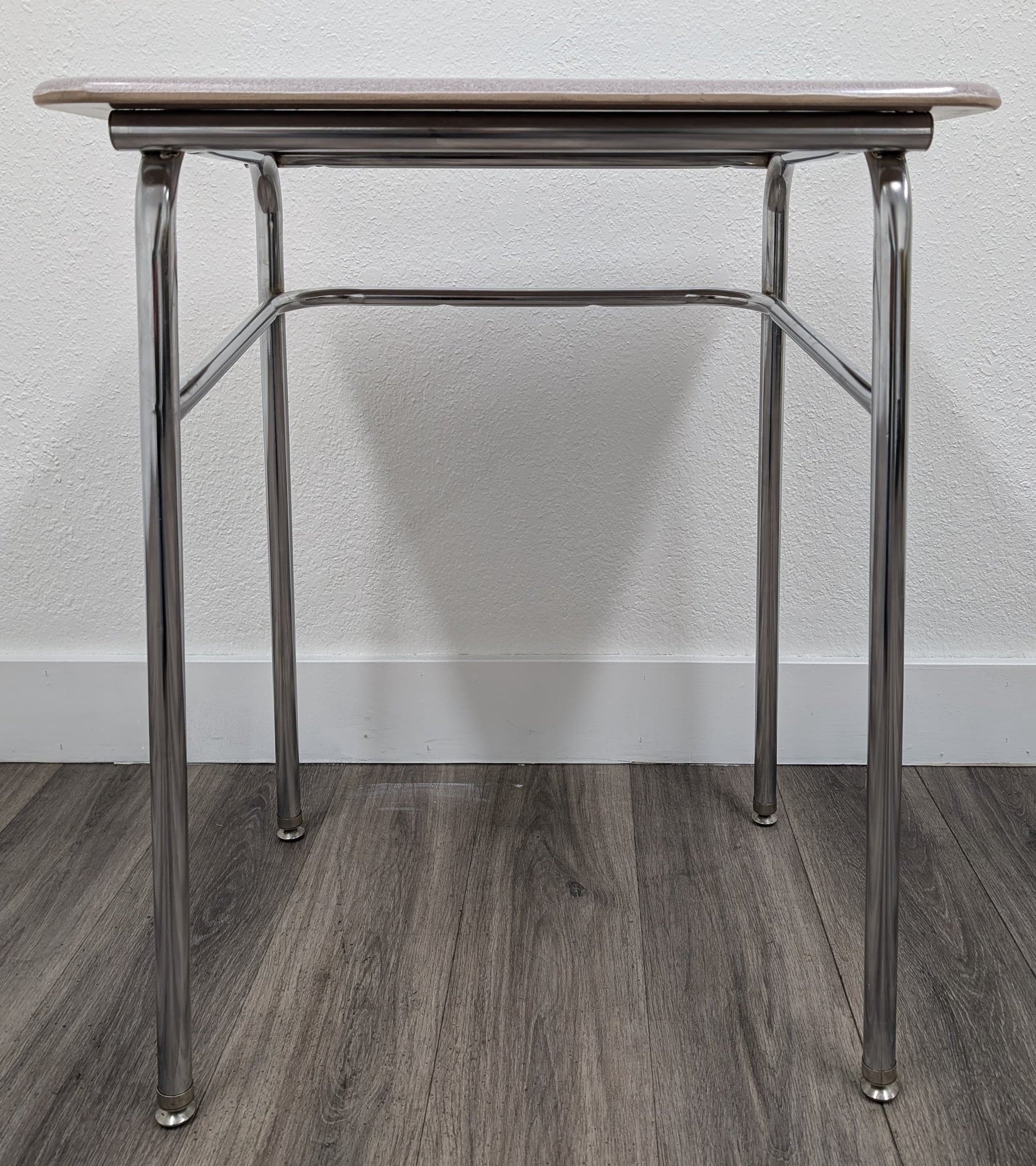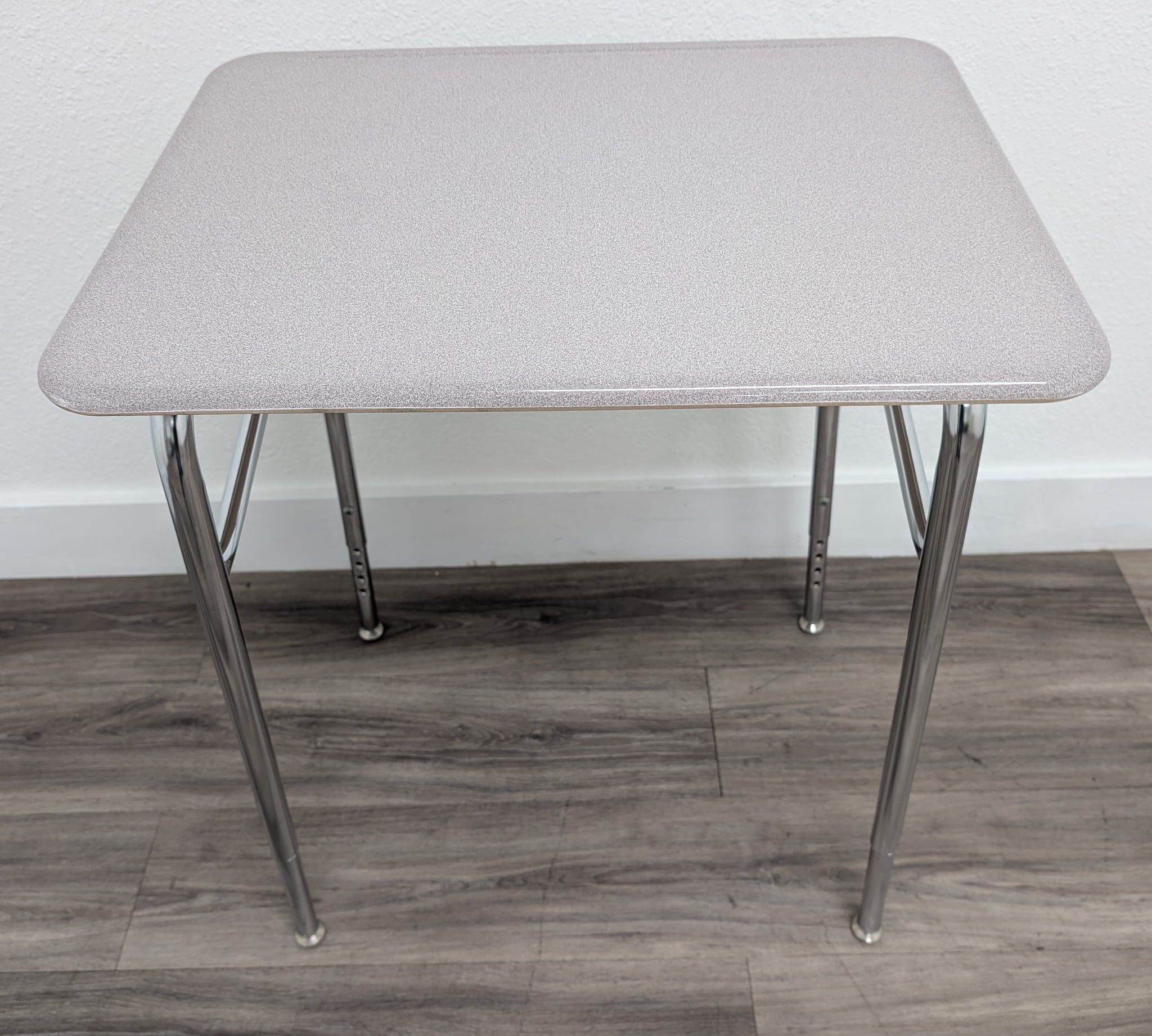 Desktop Material: Hard Plastic Frame Material: Steel with Chrome Leg Inserts Desks are gently used in Grade A condition. Will have some light scratches and marks but in Refurbished Excellent condition